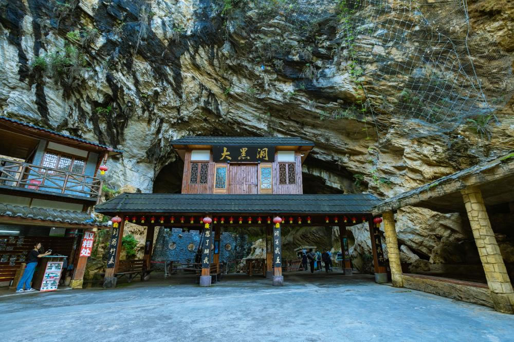 箭竹大黑洞景區(qū),位于四川省瀘州市古藺縣箭竹苗族鄉(xiāng)團(tuán)結(jié)村,景區(qū)為喀斯特地貌,擁有溶洞、森林、草場(chǎng)等自然景觀(guān)和苗族傳統(tǒng)文化人文景觀(guān)。箭竹大黑洞景區(qū)于2009年初步開(kāi)發(fā)向游人開(kāi)放;于2016年實(shí)施升級(jí)改造工程。景區(qū)景點(diǎn)有苗寨民俗文化區(qū)、大黑洞秘境觀(guān)光區(qū)、游客中心休閑運(yùn)動(dòng)體驗(yàn)區(qū)、哆彩苗嶺休閑游憩區(qū)等。由地上的桃花山和苗家上下寨和地下的大黑洞、響水洞和牛王洞等區(qū)域組成。
