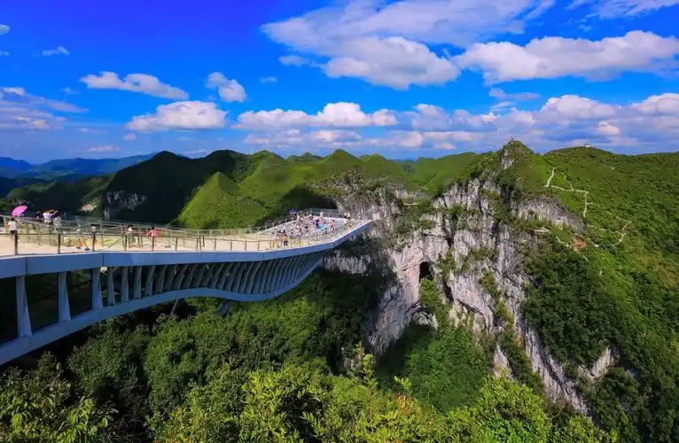 - 特色:世界最大天坑群之一,含大石圍、穿洞、白洞等7個世界級天坑,擁有613米垂直落差、9.6萬平方米地下原始森林、云海天舟懸挑玻璃觀景臺、暗河溶洞及盲魚、幽靈蜘蛛等珍稀生物,提供滑索、速降、探洞等戶外探險(xiǎn)項(xiàng)目。