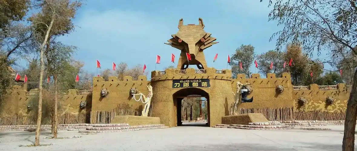 刀郎部落,位于新疆維吾爾自治區(qū)阿克蘇地區(qū)阿瓦提縣玉滿閘口胡楊林區(qū),距阿克蘇市58公里、縣城18公里,占地面積8300畝。景區(qū)以5000余畝千年原始胡楊林為生態(tài)背景,完整呈現(xiàn)刀郎人建筑、飲食及民俗文化,集中展示刀郎木卡姆、刀郎麥西熱甫等8項(xiàng)國家級和自治區(qū)級非物質(zhì)文化遺產(chǎn),其中“刀郎演唱組合”保持著最大年齡民間歌舞組合的大世界基尼斯紀(jì)錄。核心功能區(qū)包含民俗展館、千年胡楊區(qū)、鴕鳥養(yǎng)殖園區(qū)等七大板塊,復(fù)原刀郎人傳統(tǒng)居所與勞作工具,設(shè)有傳統(tǒng)手工藝作坊和勇士競技場,每日開展刀郎麥西熱甫展演、民俗婚禮體驗(yàn)及摔跤、叼羊等傳統(tǒng)體育活動。2025年入選非遺進(jìn)景區(qū)“五好”案例名單,通過非遺傳承人駐場表演、慕薩萊思釀造工藝展示及沙雕主題公園等特色項(xiàng)目,形成生態(tài)觀光與民俗體驗(yàn)深度融合的旅游模式。景區(qū)內(nèi)保留狩獵場景、農(nóng)民畫長廊及高空輪轉(zhuǎn)秋千表演,配套沉浸式互動體驗(yàn)和文創(chuàng)開發(fā)體系,實(shí)現(xiàn)刀郎文化的活態(tài)傳承。