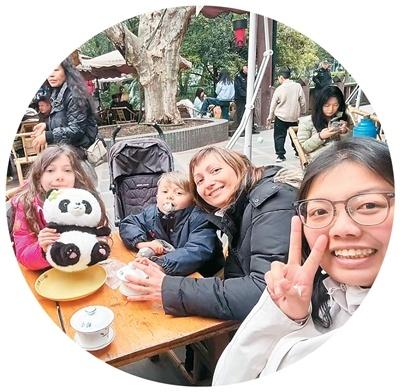 馮燕(右)與外國(guó)游客在鶴鳴茶社合影。 受訪者供圖