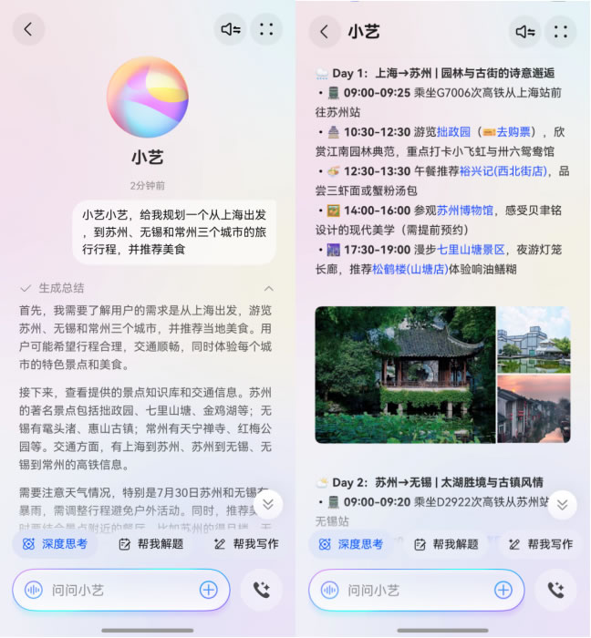 對(duì)于多城聯(lián)游來(lái)說(shuō),行程規(guī)劃十分復(fù)雜。在鴻蒙5的加持下,擁有全新大腦的對(duì)話思考式小藝變得“更聰明”,能理解用戶(hù)需求并給出針對(duì)性的回答。用戶(hù)只需對(duì)小藝說(shuō)出需求,例如:“小藝小藝,給我規(guī)劃一個(gè)蘇錫常園林和美食主題三日游。”小藝便能迅速生成一份詳盡的圖文攻略,將蘇州的古典園林、無(wú)錫的太湖風(fēng)光,以及常州獨(dú)具特色的中華恐龍園都囊括其中,給出路線、交通、美食等建議。旅途中遇到感興趣的建筑或是不認(rèn)識(shí)的植物,也可以隨時(shí)拍照后拖給小藝或圈選屏幕問(wèn)問(wèn)小藝,即時(shí)獲得百科解答,讓旅途充滿(mǎn)探索的樂(lè)趣。