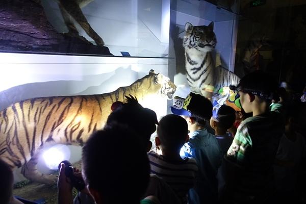 孩子們?cè)趪?guó)家動(dòng)物博物館熄燈環(huán)境里用手電筒照明,觀察孟加拉虎和東北虎標(biāo)本。受訪者供圖