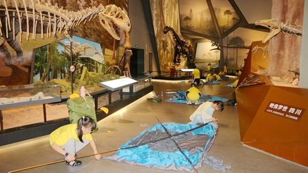 為應(yīng)對(duì)夜場(chǎng)活動(dòng)數(shù)量多、而館內(nèi)工作人員有限的情況,博物館引入專業(yè)研學(xué)團(tuán)隊(duì)負(fù)責(zé)夜宿活動(dòng)的策劃與執(zhí)行。30組親子家庭在破冰活動(dòng)后,跟隨專業(yè)講解員走進(jìn)展廳,深入了解脊椎動(dòng)物的演化歷程;體驗(yàn)4D電影和化石盲盒等手工制作;最后,在博物館鎮(zhèn)館之寶——長(zhǎng)達(dá)26米的馬門溪龍骨架化石下搭起帳篷,伴著生動(dòng)的睡前故事進(jìn)入夢(mèng)鄉(xiāng)。