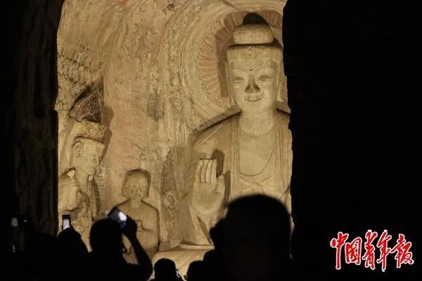 8月19日,河南洛陽(yáng),游客在夜色中參觀龍門(mén)石窟的賓陽(yáng)洞。中青報(bào)·中青網(wǎng)記者 余冰玥/攝