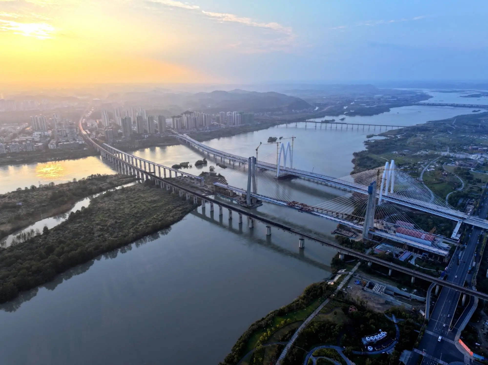 遂寧涪江特大橋位于四川省遂寧市船山區(qū)境內(nèi),是全線“3隧4橋”重難點控制性工程之一,大橋全長5585.4米。主橋為“H”型特殊結(jié)構(gòu)雙塔雙索面鋼混結(jié)合梁斜拉橋,主跨長305米,是雙塔雙索面鋼混結(jié)合梁斜拉橋中主跨長度位居西南第一,全國第二的橋梁。兩座主塔分別高達118米和122米,梁面距離涪江江面25米。施工過程面臨工藝復(fù)雜多樣、高空作業(yè)安全風(fēng)險高、大跨徑斜拉橋線形控制難度大等多重挑戰(zhàn)。