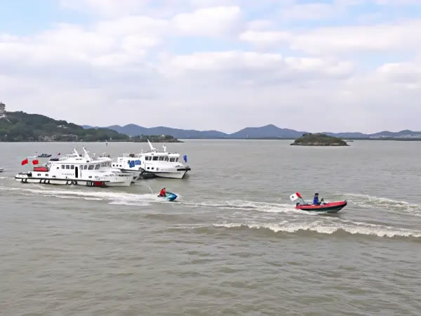 本次演練以“實(shí)戰(zhàn)導(dǎo)向、效果為先”為原則,模擬船舶碰撞、人員落水等極端場(chǎng)景,共分為旅游船舶開(kāi)航前自查、旅游船舶環(huán)太湖聯(lián)動(dòng)動(dòng)態(tài)監(jiān)測(cè)、極端天氣旅游船舶應(yīng)對(duì)處置、旅游船舶險(xiǎn)情處置、人員落水應(yīng)急處置5個(gè)科目。其中,旅游船舶開(kāi)航前自查科目中,對(duì)照《中國(guó)籍船舶開(kāi)航前自查清單》嚴(yán)格開(kāi)展自查工作,確保船舶適航、人員適配,保證航行安全。環(huán)太湖旅游船舶聯(lián)動(dòng)動(dòng)態(tài)監(jiān)測(cè)科目驗(yàn)證了現(xiàn)有監(jiān)控系統(tǒng)對(duì)湖區(qū)船舶的精準(zhǔn)感知與實(shí)時(shí)管控能力,檢驗(yàn)了跨區(qū)域多部門(mén)協(xié)同響應(yīng)機(jī)制的可行性與高效性。極端天氣旅游船舶應(yīng)對(duì)處置科目模擬旅游船舶航行途中遭遇極端天氣,“蘇交執(zhí)法錫039”輪、“湖州執(zhí)法艇浙交巡0328”輪迅速進(jìn)入伴航狀態(tài),與游船配合形成“兩艇護(hù)一船”的防護(hù)陣形,全程護(hù)航,實(shí)時(shí)監(jiān)測(cè)周邊水域動(dòng)態(tài)、規(guī)避潛在風(fēng)險(xiǎn),主動(dòng)提供必要的航行協(xié)助。旅游船舶險(xiǎn)情處置科目充分展示旅游船舶在航行過(guò)程中突發(fā)極端天氣的全過(guò)程應(yīng)對(duì)處置,包括預(yù)警接收、封航、應(yīng)急避險(xiǎn)、協(xié)同數(shù)援、人員轉(zhuǎn)運(yùn)。人員落水應(yīng)急處置科目中,應(yīng)用無(wú)人機(jī)、遙控救生機(jī)器人新型智能裝備與數(shù)字化技術(shù),為最大限度挽救生命提供堅(jiān)實(shí)保障。
