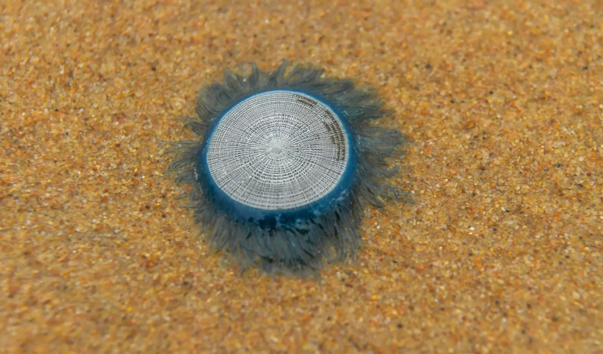 經(jīng)海口市資規(guī)局聯(lián)同海南省海洋監(jiān)測預(yù)報中心專家取樣鑒定,這些圓形藍(lán)色生物為銀幣水母,其浮囊體硬而透明,質(zhì)輕呈圓盤狀,觸手上有刺絲囊,毒性相對較弱。該物種自身無游泳能力,其移動完全依賴海流驅(qū)動,本次銀幣水母上岸原因,或是受臺風(fēng)“風(fēng)神”影響,被強(qiáng)風(fēng)和大浪推上海岸。