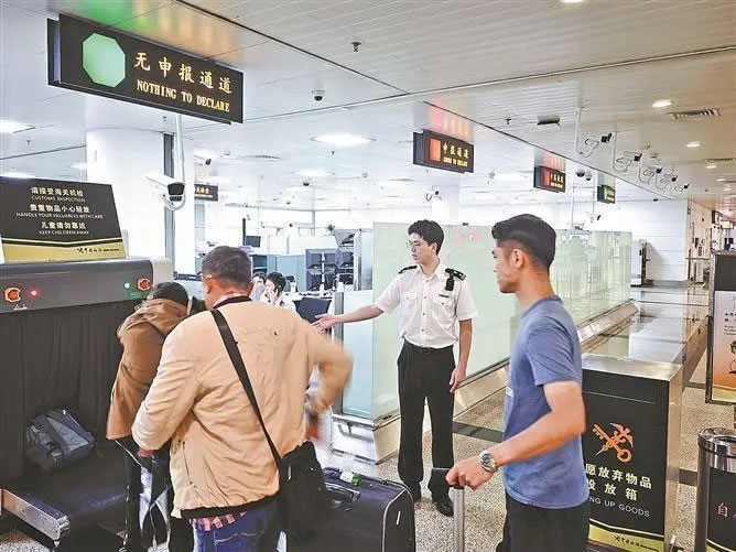 廈門機(jī)場(chǎng)海關(guān)關(guān)員對(duì)進(jìn)境旅客開展監(jiān)管作業(yè)。(通訊員 于挺洋 攝)